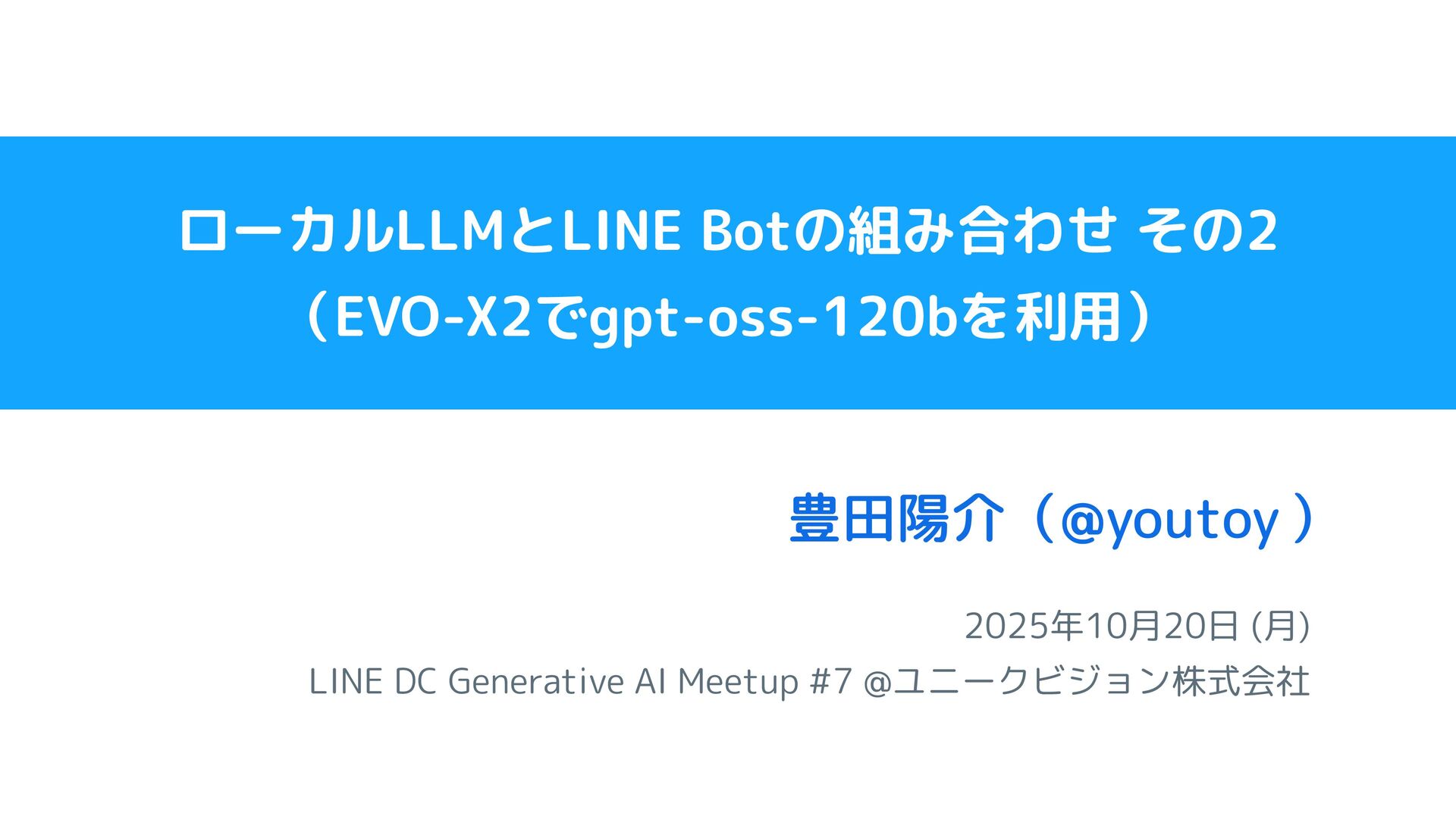 ローカルLLMとLINE Botの組み合わせ その2(EVO-X2でgpt-oss-120bを利用) / LINE DC Generative AI Meetup #7