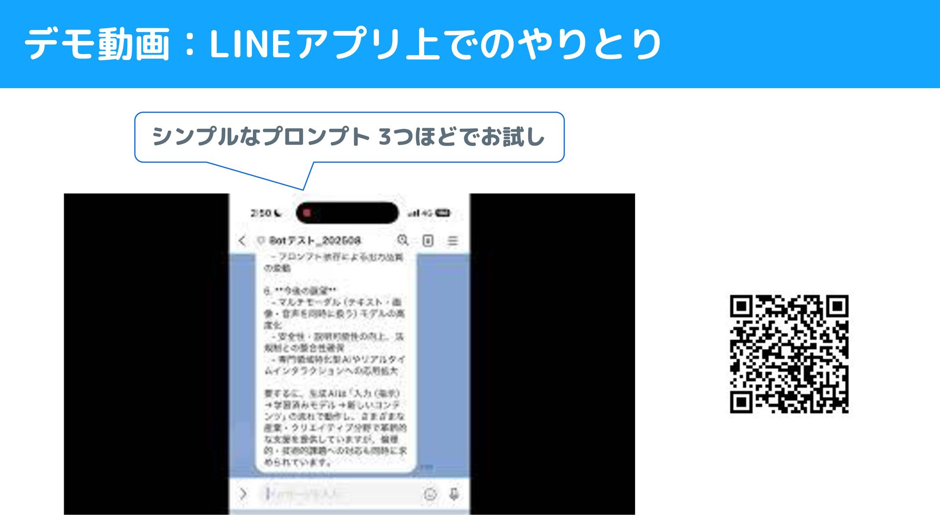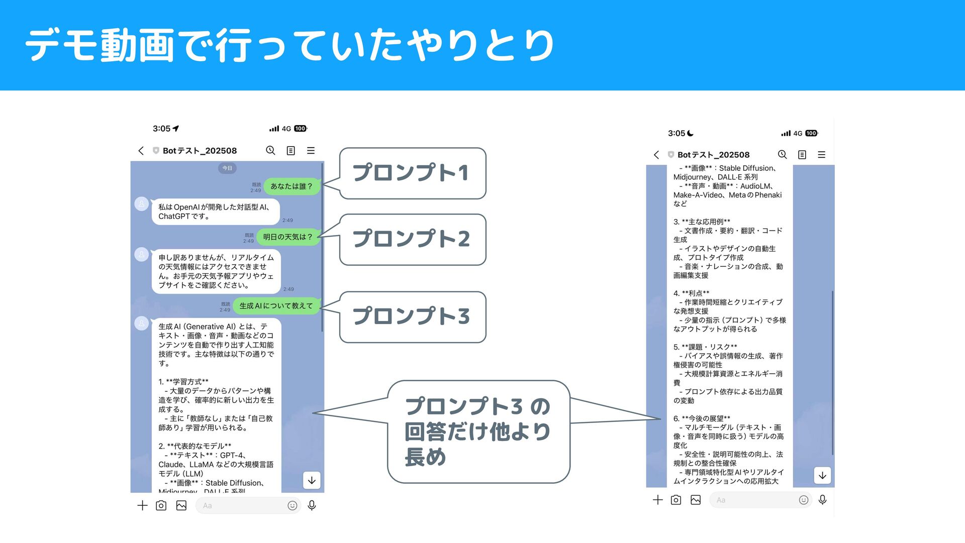 デモ動画:LINEアプリ上でのやりとり シンプルなプロンプト 3つほどでお試し