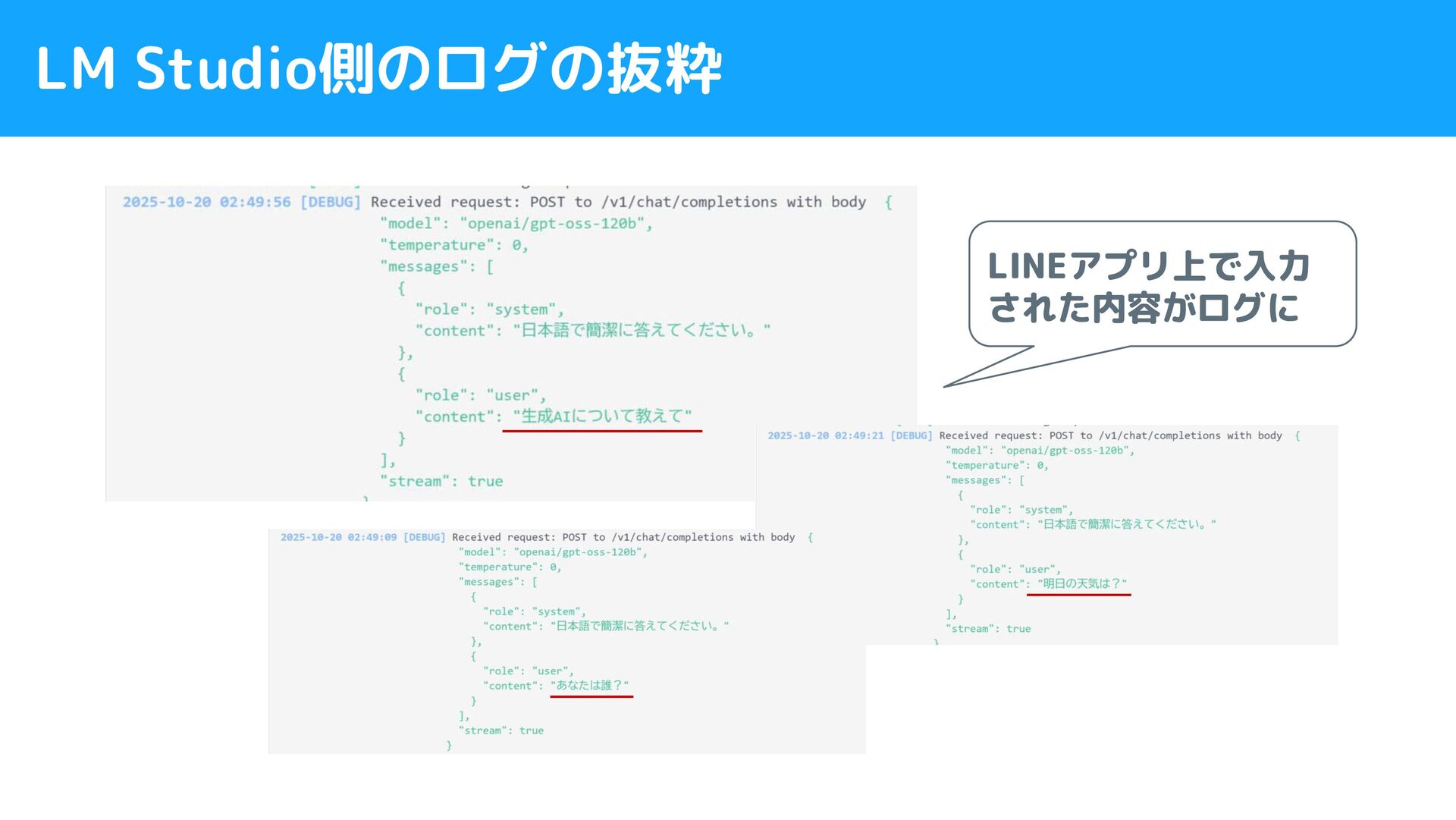 LM Studio側のログの抜粋 LINEアプリ上で入力 された内容がログに