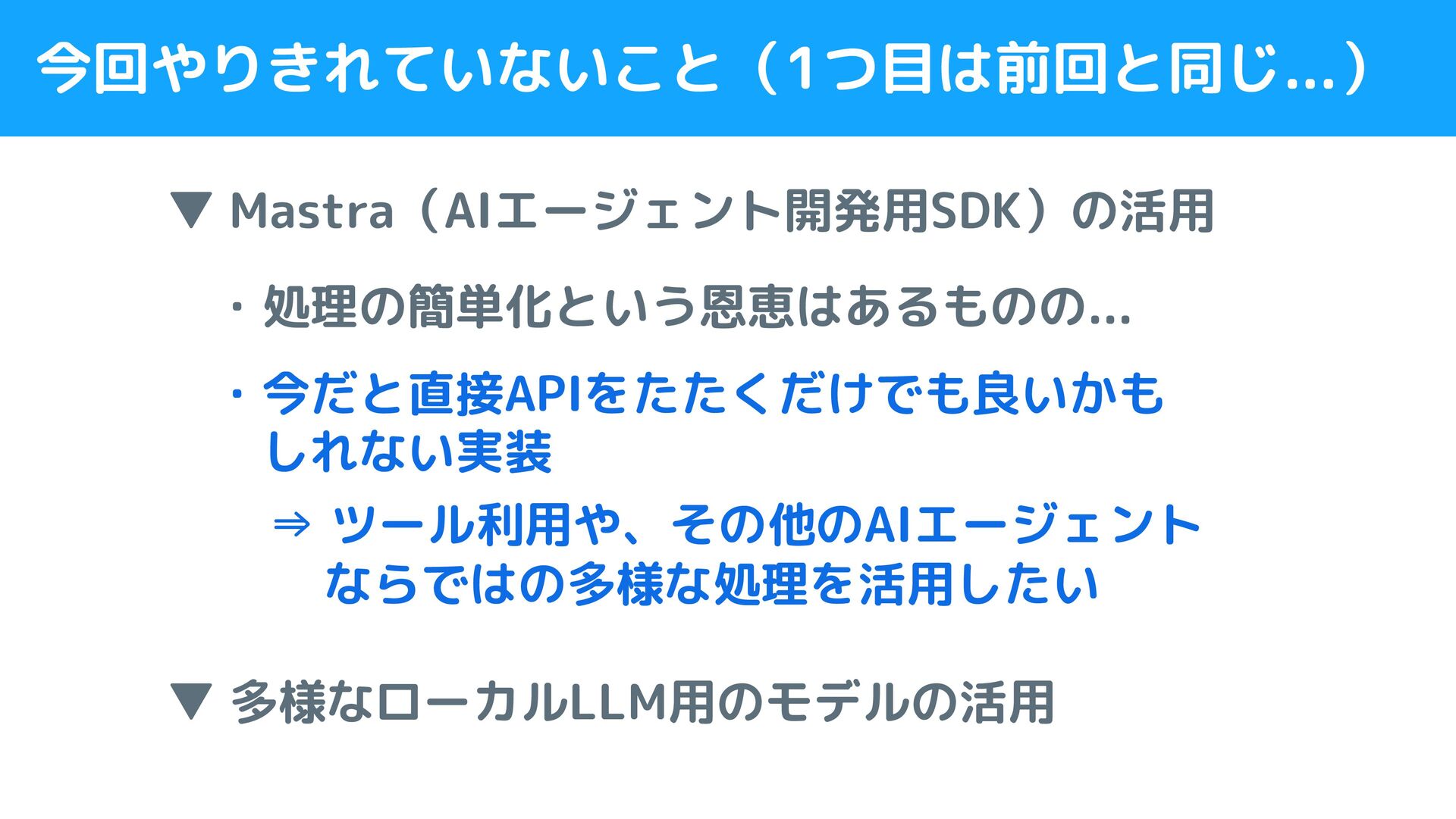 今回やりきれていないこと(1つ目は前回と同じ...) ・処理の簡単化という恩恵はあるものの... ・今だと直接APIをたたくだけでも良いかも しれない実装 ⇒ ツール利用や、その他のAIエージェント ならではの多様な処理を活用したい ▼ Mastra(AIエージェント開発用SDK)の活用