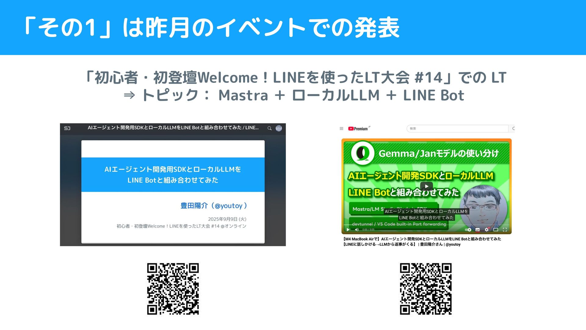 「その1」は昨月のイベントでの発表 「初心者・初登壇Welcome!LINEを使ったLT大会 #14」での LT ⇒ トピック: Mastra + ローカルLLM +