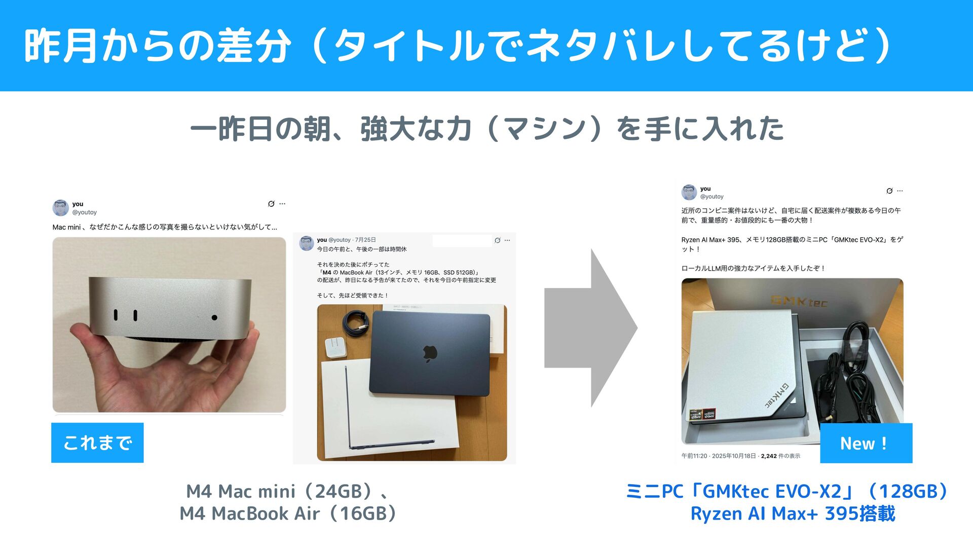 ミニPC「GMKtec EVO-X2」(128GB) Ryzen AI Max+ 395搭載 昨月からの差分(タイトルでネタバレしてるけど) 一昨日の朝、強大な力(マシン)を手に入れた M4 Mac