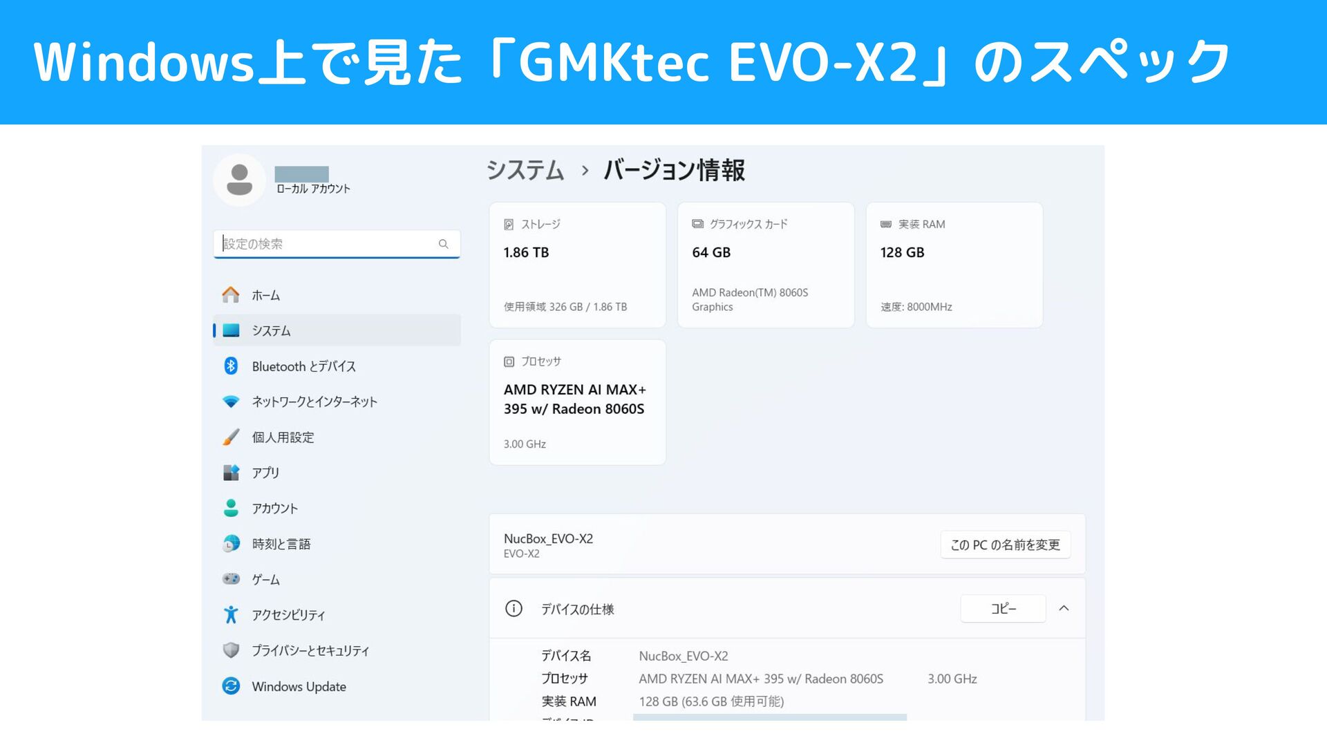 Windows上で見た「GMKtec EVO-X2」のスペック