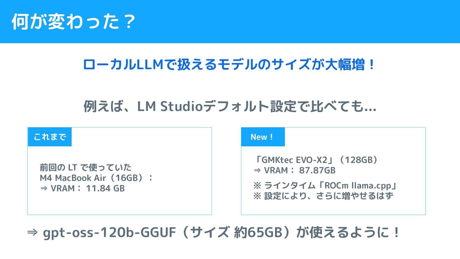 何が変わった? ローカルLLMで扱えるモデルのサイズが大幅増! 前回の LT で使っていた M4 MacBook Air(16GB): ⇒ VRAM: