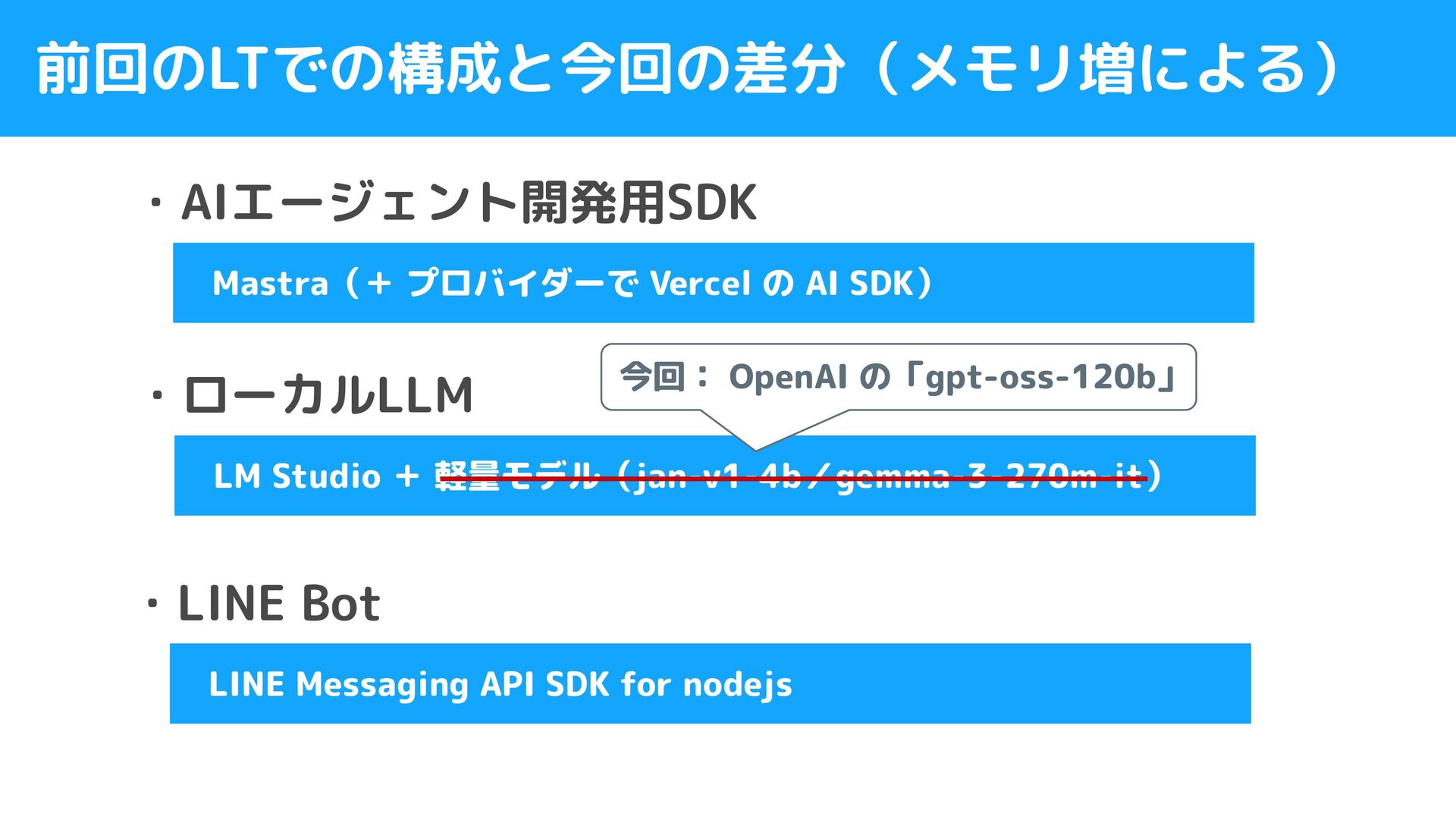 前回のLTでの構成と今回の差分(メモリ増による) ・AIエージェント開発用SDK Mastra(+ プロバイダーで Vercel の AI SDK) ・ローカルLLM LM