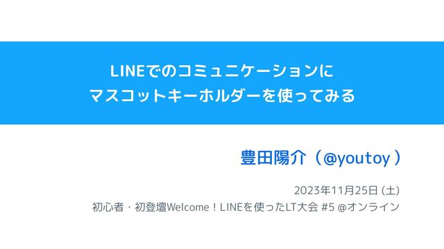 2023年11月25日 (土) 初心者・初登壇Welcome!LINEを使ったLT大会 #5 @オンライン 豊田陽介( ) @youtoy LINEでのコミュニケーションに マスコットキーホルダーを使ってみる