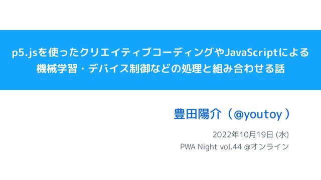p5.jsを使ったクリエイティブコーディングやJavaScriptによる 機械学習・デバイス制御などの処理と組み合わせる話 2022年10月19日 (水) PWA Night vol.44 @オンライン 豊田陽介( )