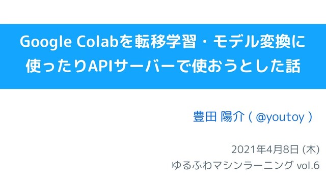 Google Colabを転移学習・モデル変換に 使ったりAPIサーバーで使おうとした話 2021年4月8日 (木) ゆるふわマシンラーニング vol.6 豊田 陽介 (