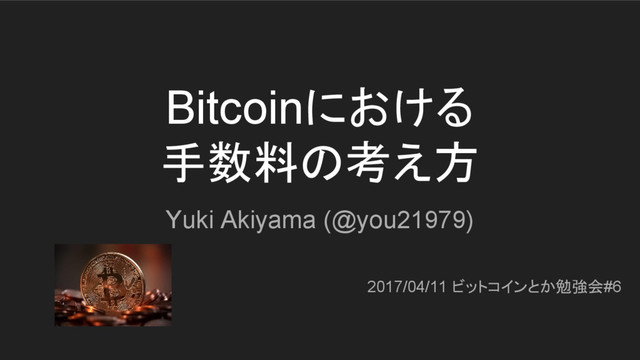 Bitcoinにおける 手数料の考え方 Yuki Akiyama (@you21979) 2017/04/11 ビットコインとか勉強会#6