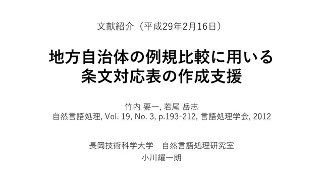 ⻑岡技術科学⼤学 ⾃然⾔語処理研究室 ⼩川耀⼀朗 ⽂献紹介(平成29年2⽉16⽇) 地⽅⾃治体の例規⽐較に⽤いる 条⽂対応表の作成⽀援 ⽵内 要⼀, 若尾 岳志