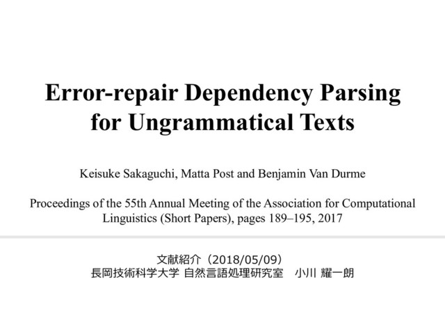 and Benjamin Van Durme Proceedings of the 55th Annual Meeting of the Association for Computational Linguistics (Short Papers), pages 189–195, 2017 ⽂献紹介(2018/05/09) ⻑岡技術科学⼤学 ⾃然⾔語処理研究室 ⼩川 耀⼀朗 1