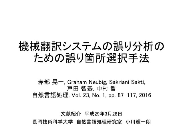 機械翻訳システムの誤り分析の ための誤り箇所選択手法 赤部 晃一, Graham Neubig, Sakriani Sakti, 戸田 智基,