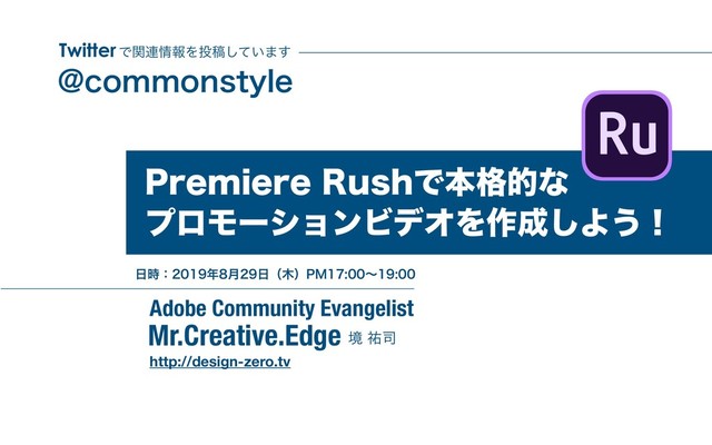 1SFNJFSF3VTIͰຊ֨తͳ ϓϩϞʔγϣϯϏσΦΛ࡞͠Α͏ʂ ࣌ɿ݄ʢʣ1.ʙ http://design-zero.tv TwitterͰؔ࿈ใΛߘ͍ͯ͠·͢ !DPNNPOTUZMF Adobe Community Evangelist Mr.Creative.Edge