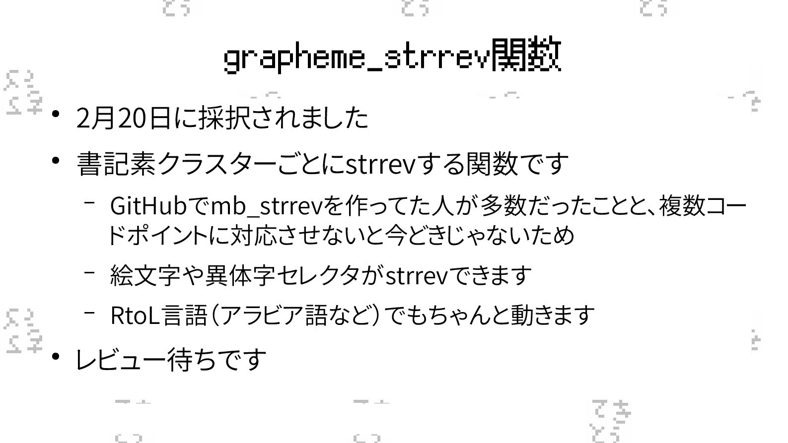 grapheme_strrev関数 • 2月20日に採択されました • 書記素クラスターごとにstrrevする関数です – GitHubでmb_strrevを作ってた人が多数だったことと、複数コー ドポイントに対応させないと今どきじゃないため – 絵文字や異体字セレクタがstrrevできます