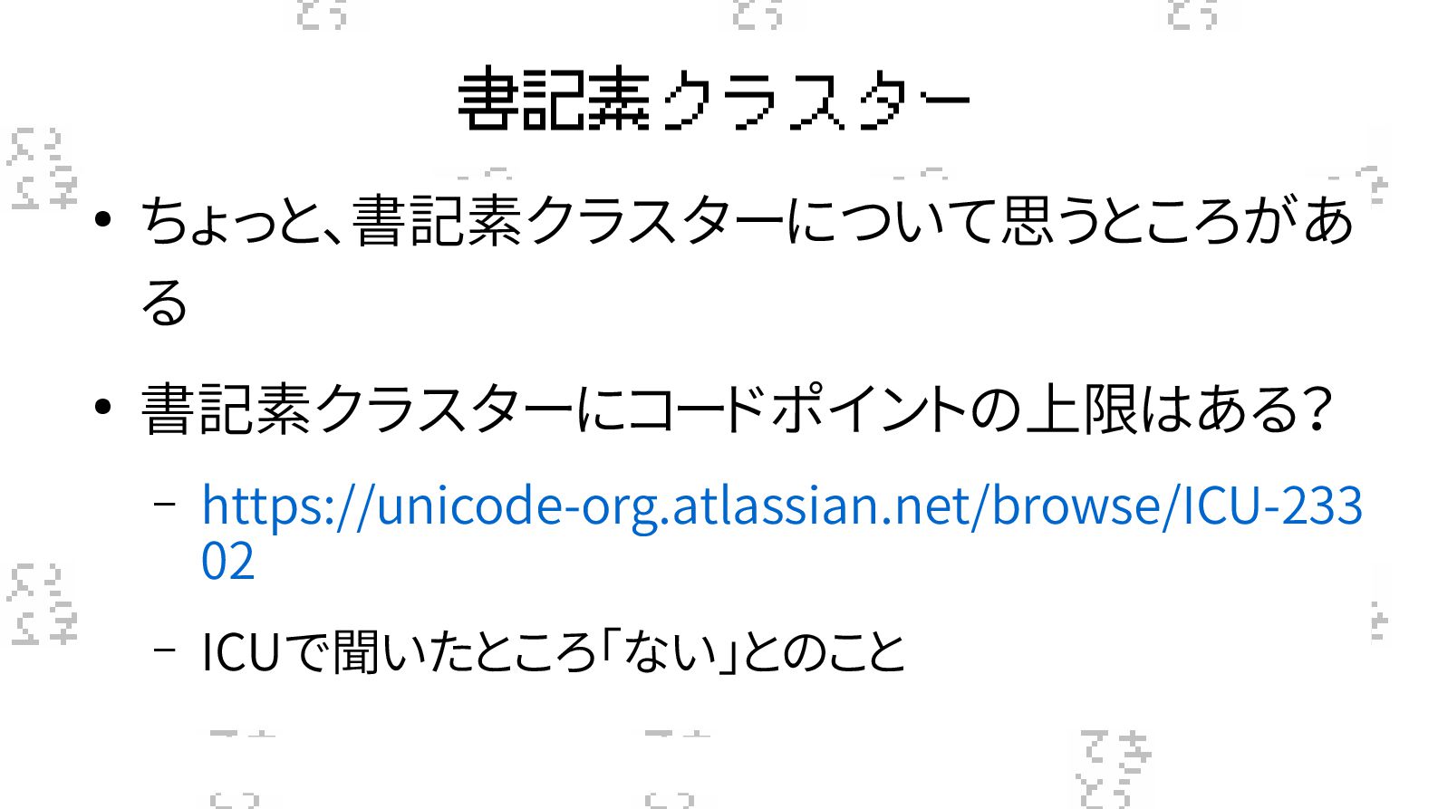 書記素クラスター • ちょっと、書記素クラスターについて思うところがあ る • 書記素クラスターにコードポイントの上限はある? – https://unicode-org.atlassian.net/browse/ICU-233 02 –