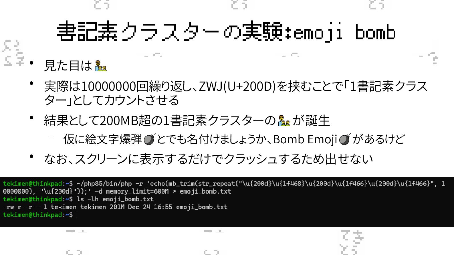 書記素クラスターの実験:emoji bomb • 見た目は 👨👦👦 • 実際は10000000回繰り返し、ZWJ(U+200D)を挟むことで「1書記素クラス ター」としてカウントさせる • 結果として200MB超の1書記素クラスターの