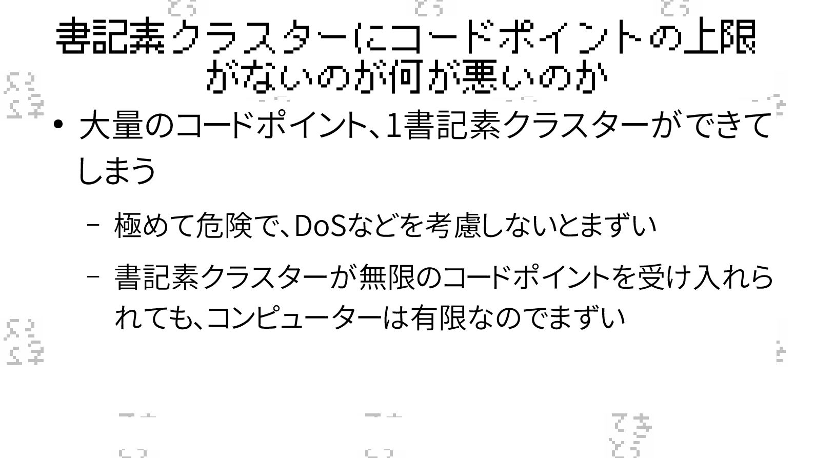書記素クラスターにコードポイントの上限 がないのが何が悪いのか • 大量のコードポイント、1書記素クラスターができて しまう – 極めて危険で、DoSなどを考慮しないとまずい – 書記素クラスターが無限のコードポイントを受け入れら れても、コンピューターは有限なのでまずい