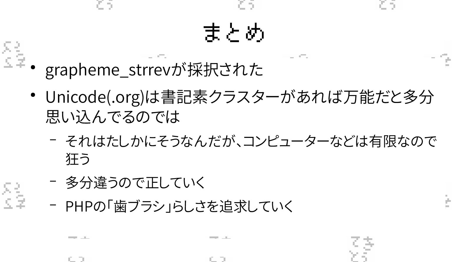まとめ • grapheme_strrevが採択された • Unicode(.org)は書記素クラスターがあれば万能だと多分 思い込んでるのでは – それはたしかにそうなんだが、コンピューターなどは有限なので 狂う –