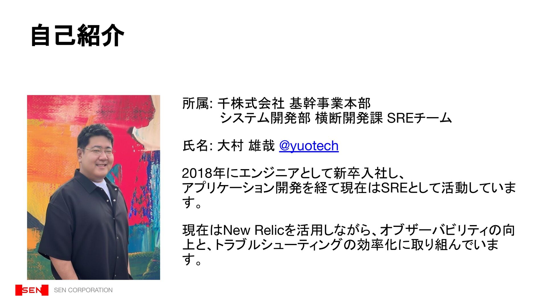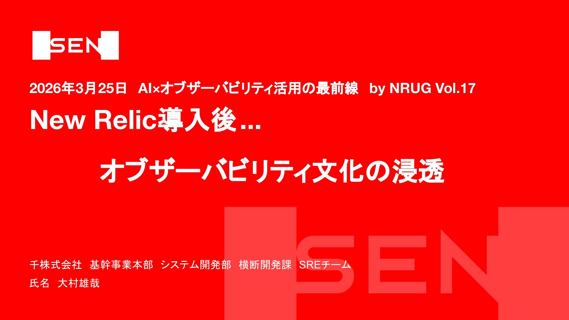 氏名 大村雄哉 New Relic導入後... オブザーバビリティ文化の浸透 2026年3月25日 AI×オブザーバビリティ活用の最前線 by NRUG Vol.17 千株式会社 基幹事業本部 システム開発部 横断開発課 SREチーム