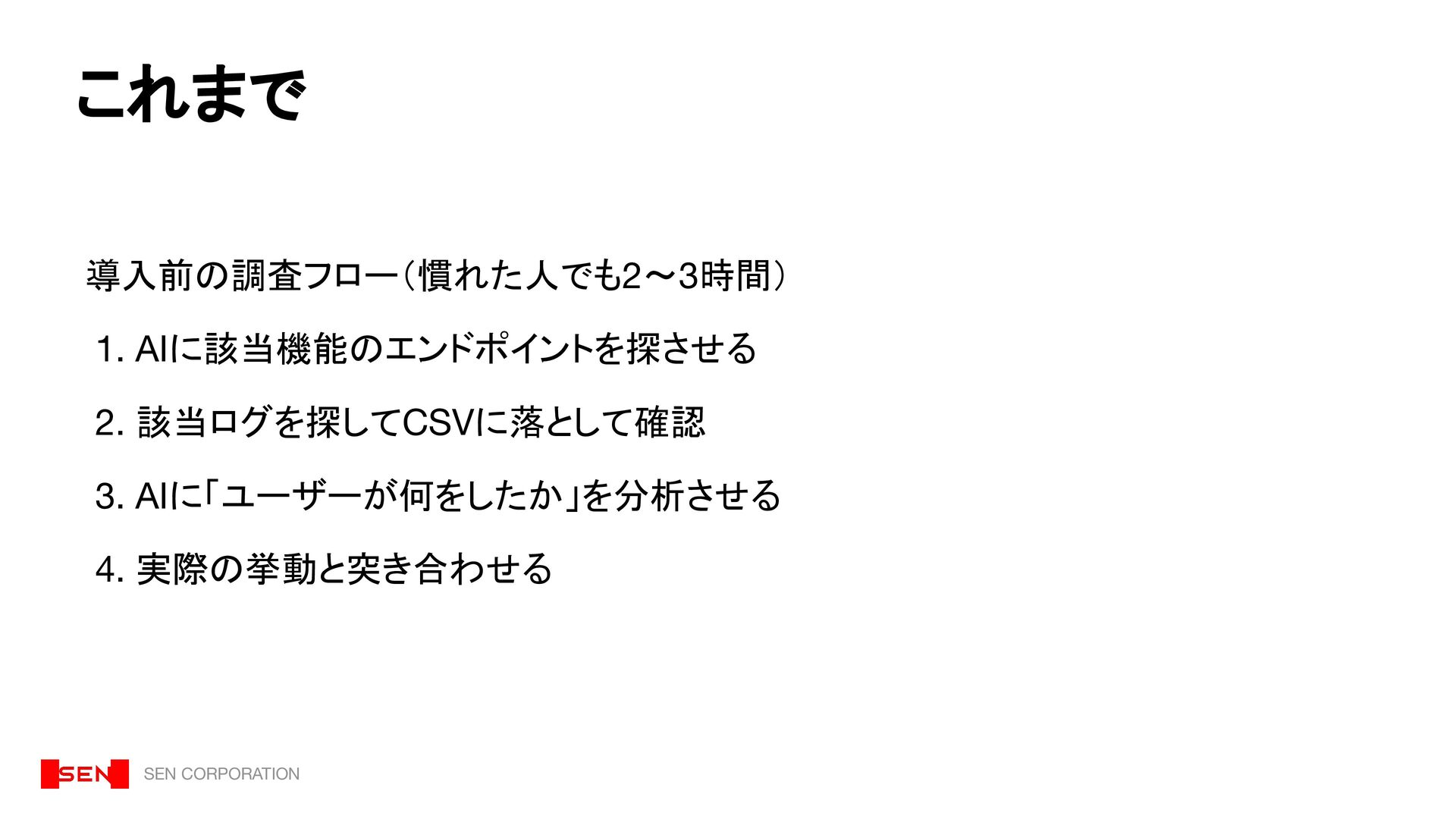 SEN CORPORATION これまで 導入前の調査フロー(慣れた人でも2〜3時間) 1. AIに該当機能のエンドポイントを探させる 2. 該当ログを探してCSVに落として確認 3. AIに「ユーザーが何をしたか」を分析させる