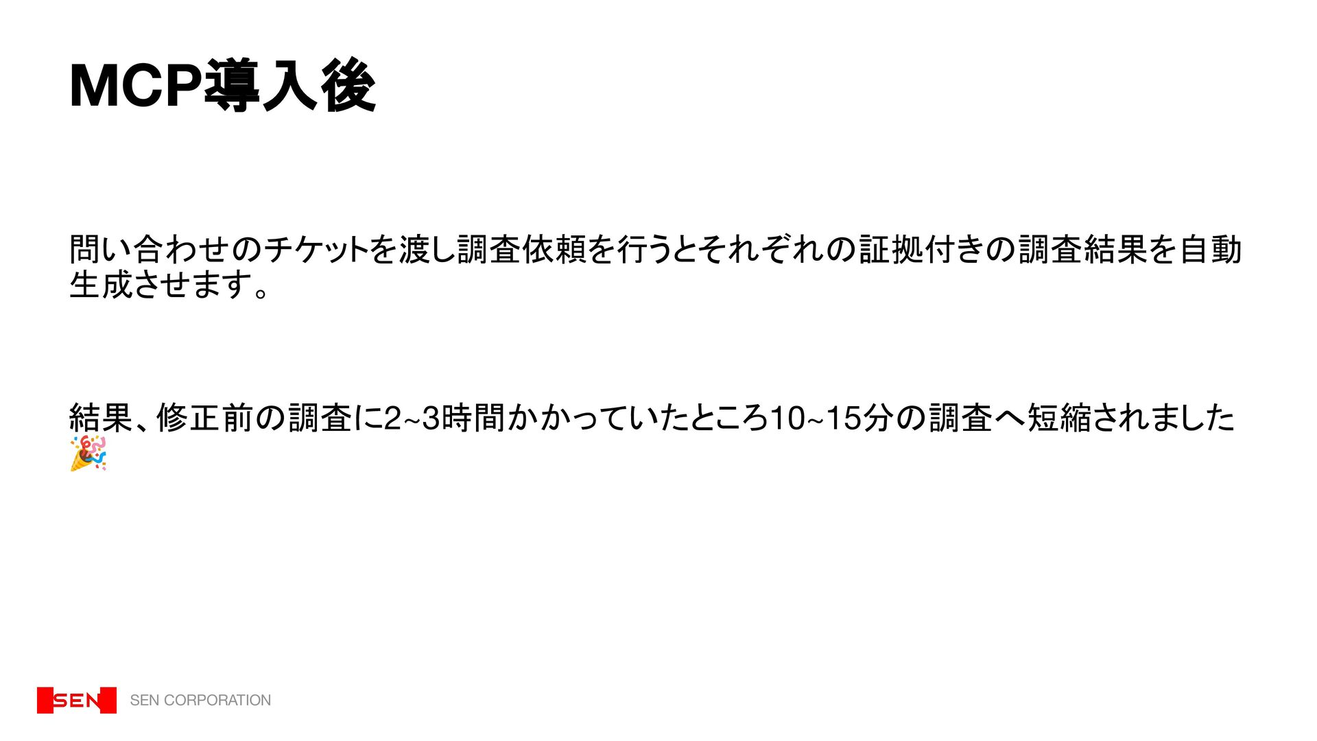 SEN CORPORATION MCP導入後 問い合わせのチケットを渡し調査依頼を行うとそれぞれの証拠付きの調査結果を自動 生成させます。 結果、修正前の調査に2~3時間かかっていたところ10~15分の調査へ短縮されました 🎉