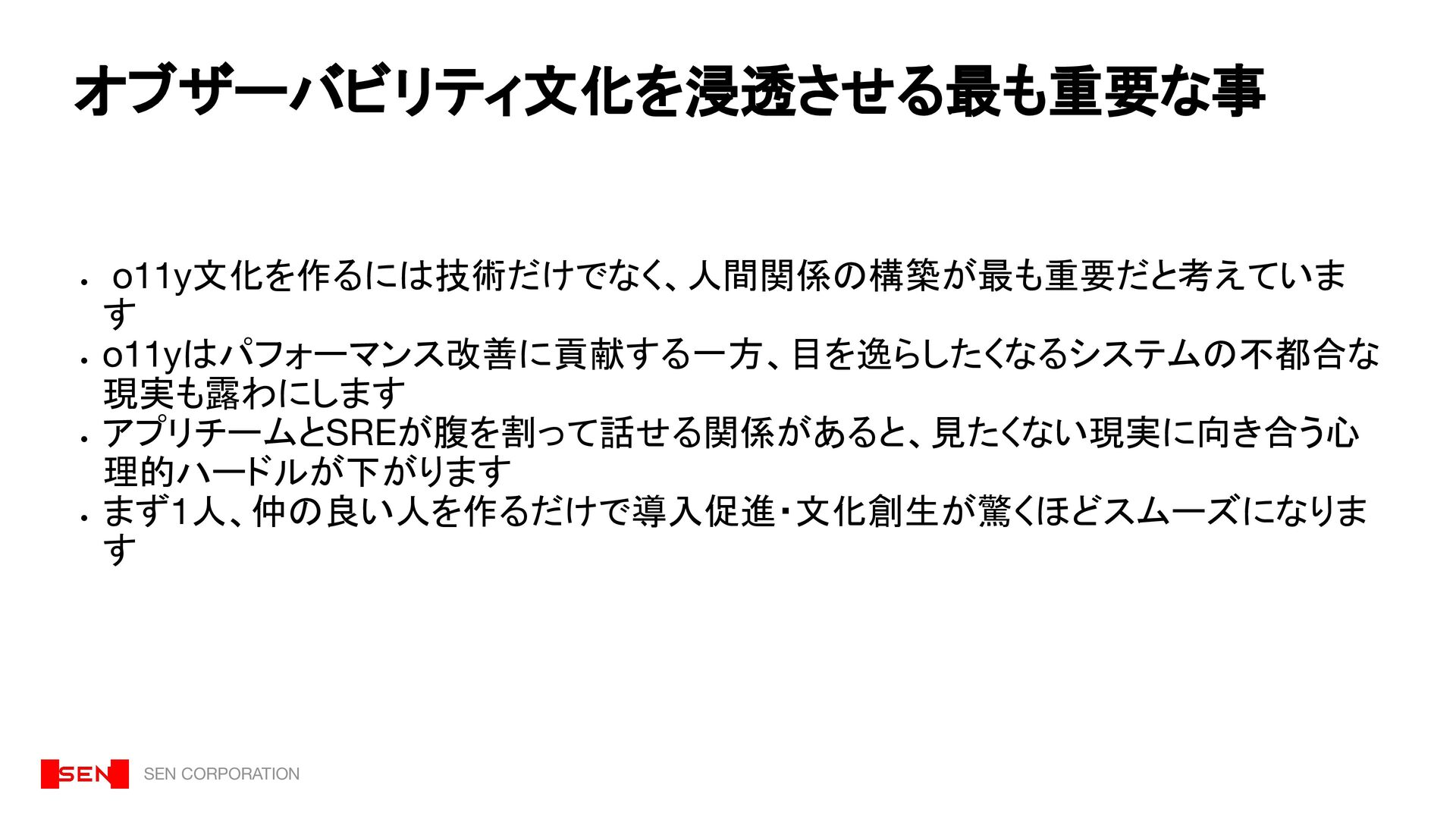 SEN CORPORATION オブザーバビリティ文化を浸透させる最も重要な事 • o11y文化を作るには技術だけでなく、人間関係の構築が最も重要だと考えていま す • o11yはパフォーマンス改善に貢献する一方、目を逸らしたくなるシステムの不都合な 現実も露わにします •