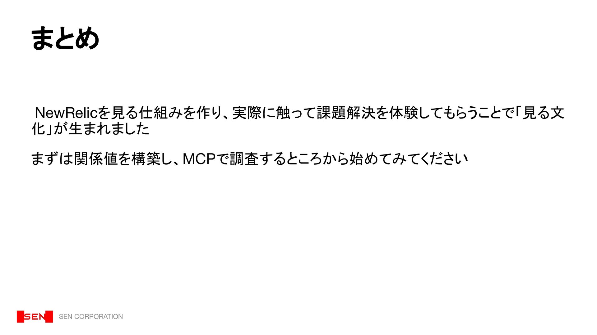 SEN CORPORATION まとめ NewRelicを見る仕組みを作り、実際に触って課題解決を体験してもらうことで「見る文 化」が生まれました まずは関係値を構築し、MCPで調査するところから始めてみてください