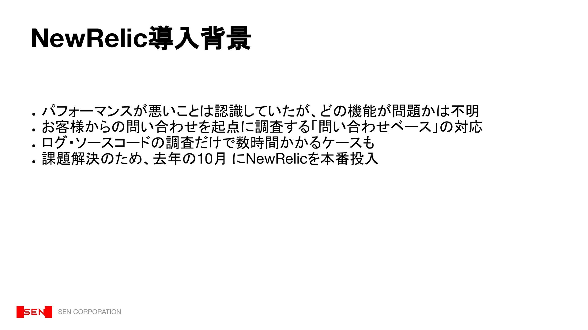 SEN CORPORATION NewRelic導入背景 • パフォーマンスが悪いことは認識していたが、どの機能が問題かは不明 • お客様からの問い合わせを起点に調査する「問い合わせベース」の対応 • ログ・ソースコードの調査だけで数時間かかるケースも •