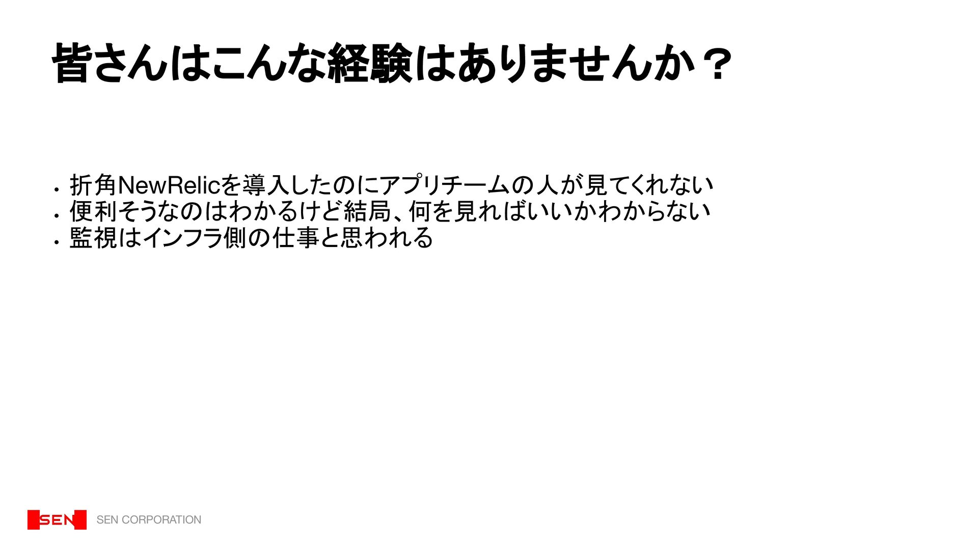 SEN CORPORATION 皆さんはこんな経験はありませんか? • 折角NewRelicを導入したのにアプリチームの人が見てくれない • 便利そうなのはわかるけど結局、何を見ればいいかわからない • 監視はインフラ側の仕事と思われる