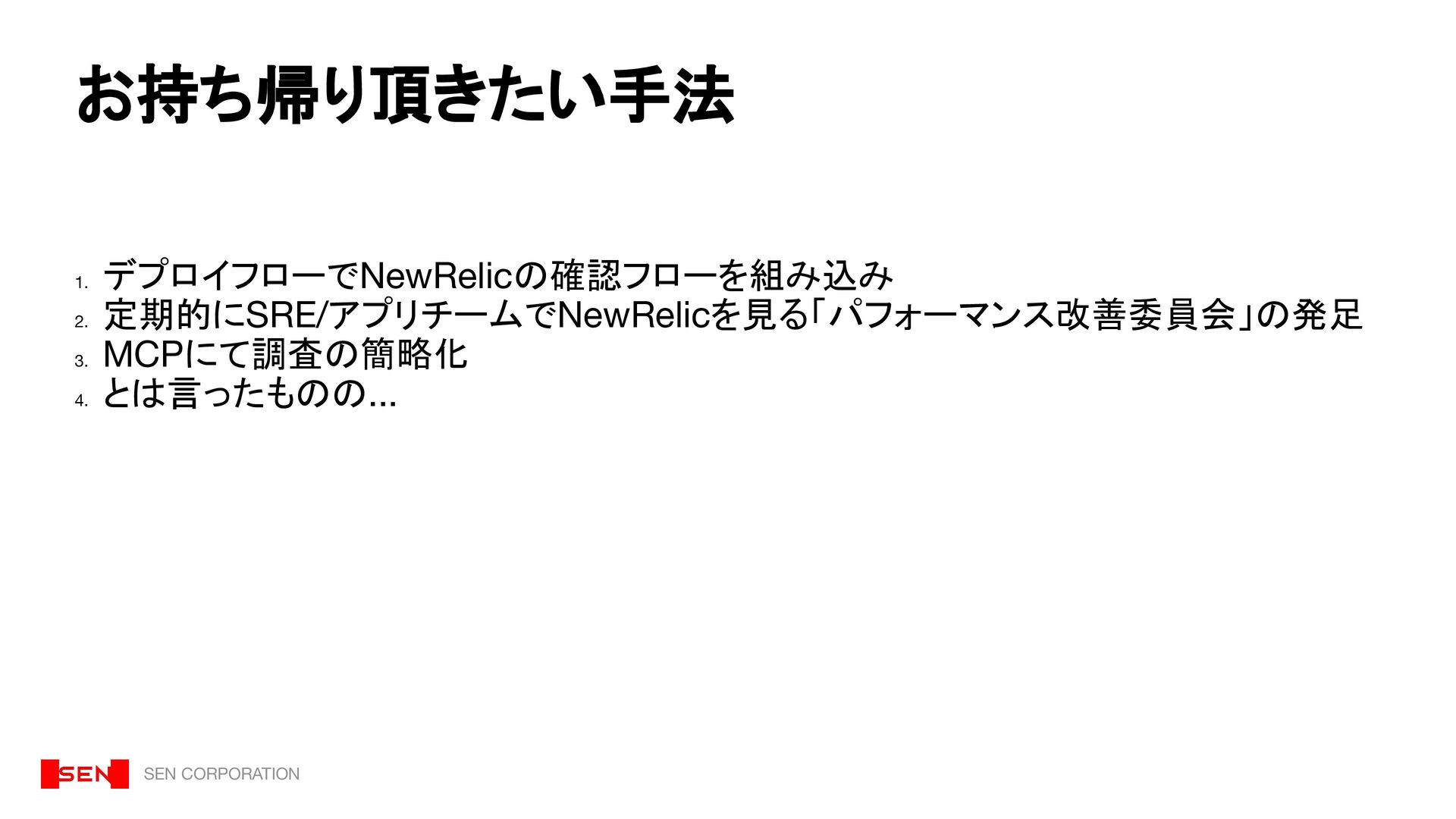 SEN CORPORATION お持ち帰り頂きたい手法 1. デプロイフローでNewRelicの確認フローを組み込み 2. 定期的にSRE/アプリチームでNewRelicを見る「パフォーマンス改善委員会」の発足 3. MCPにて調査の簡略化 4.