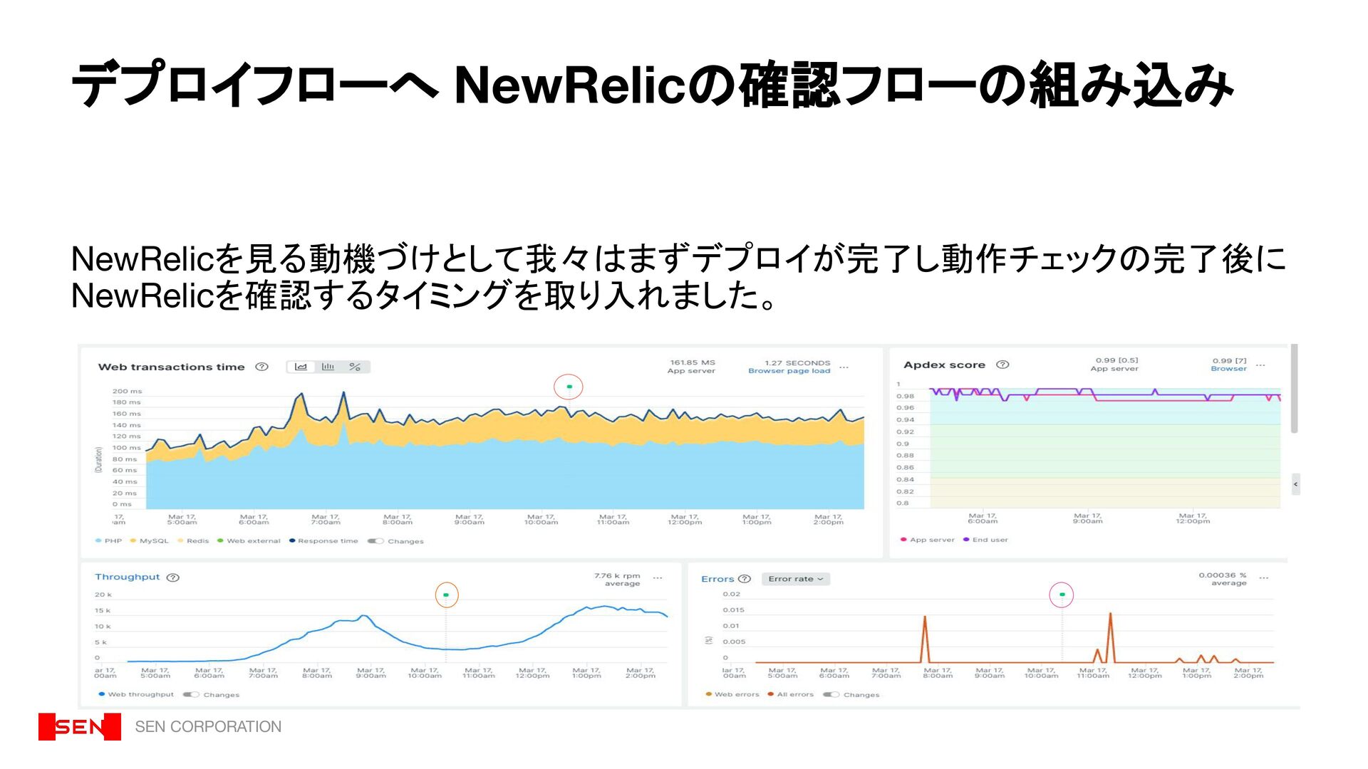 SEN CORPORATION デプロイフローへ NewRelicの確認フローの組み込み NewRelicを見る動機づけとして我々はまずデプロイが完了し動作チェックの完了後に NewRelicを確認するタイミングを取り入れました。