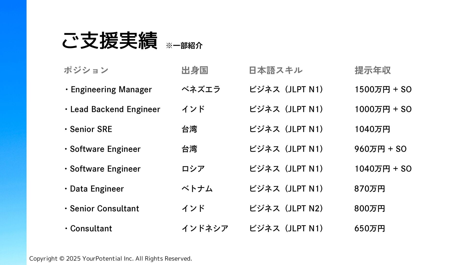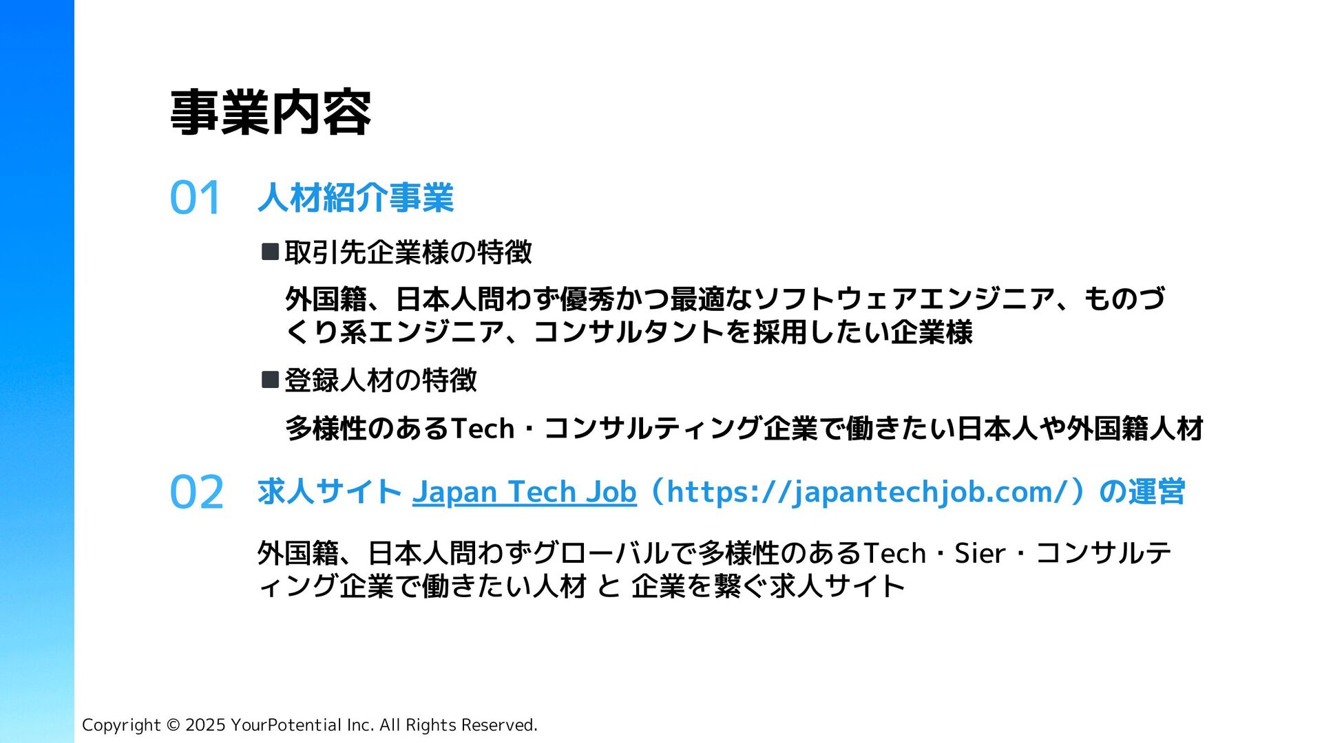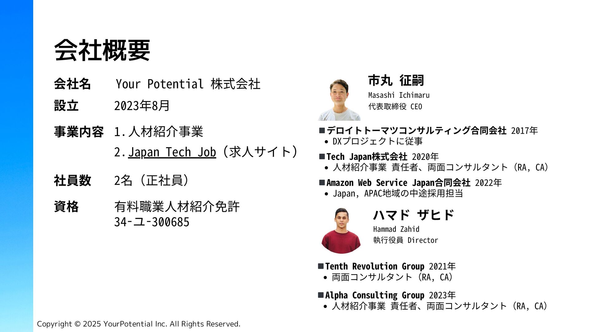 Tech Job (求人サイト) 資格 有料職業人材紹介免許 34-ユ-300685 市丸 征嗣 Masashi Ichimaru ◾️デロイトトーマツコンサルティング合同会社 2017年 DXプロジェクトに従事 代表取締役 CEO Copyright © 2025 YourPotential Inc. All Rights Reserved. 社員数 2名(正社員) ◾️Tech Japan株式会社 2020年 人材紹介事業 責任者、両面コンサルタント(RA, CA) ◾️Amazon Web Service Japan合同会社 2022年 Japan, APAC地域の中途採用担当 ハマド ザヒド Hammad Zahid 執行役員 Director ◾️Tenth Revolution Group 2021年 両面コンサルタント(RA, CA) ◾️Alpha Consulting Group 2023年 人材紹介事業 責任者、両面コンサルタント(RA, CA)