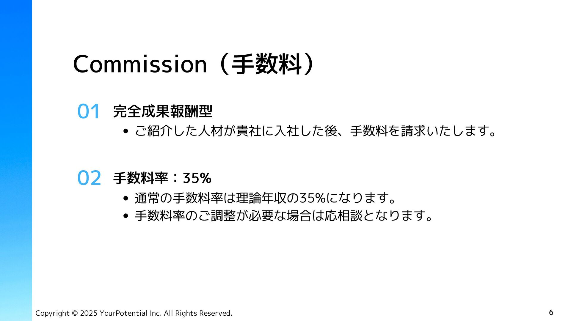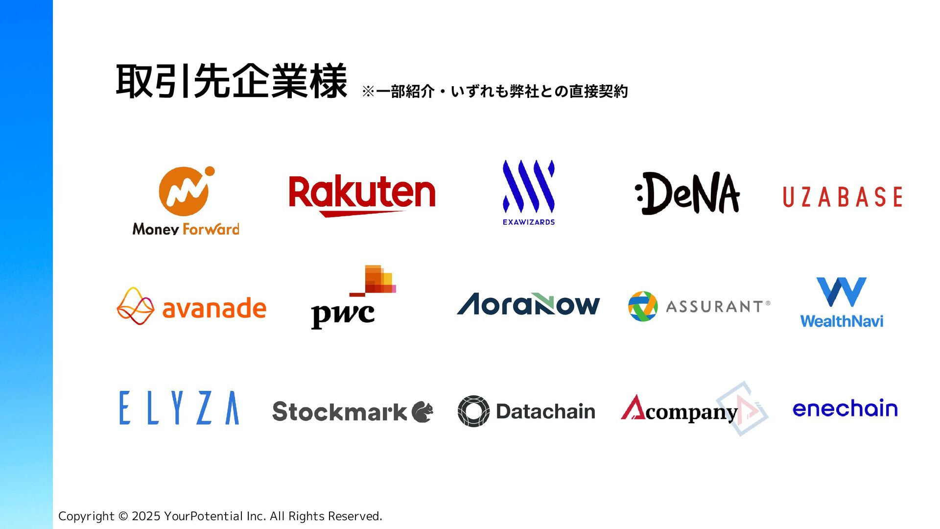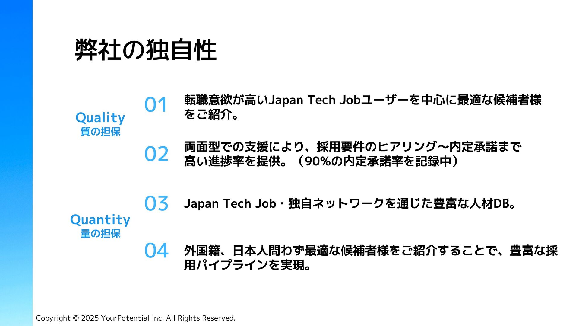 Tech Job (求人サイト) 資格 有料職業人材紹介免許 34-ユ-300685 市丸 征嗣 Masashi Ichimaru ◾️デロイトトーマツコンサルティング合同会社 2017年 DXプロジェクトに従事 代表取締役 CEO Copyright © 2025 YourPotential Inc. All Rights Reserved. 社員数 2名(正社員) ◾️Tech Japan株式会社 2020年 人材紹介事業 責任者、両面コンサルタント(RA, CA) ◾️Amazon Web Service Japan合同会社 2022年 Japan, APAC地域の中途採用担当 ハマド ザヒド Hammad Zahid 執行役員 Director ◾️Tenth Revolution Group 2021年 両面コンサルタント(RA, CA) ◾️Alpha Consulting Group 2023年 人材紹介事業 責任者、両面コンサルタント(RA, CA)