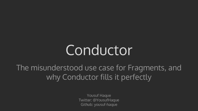 gotten in to this entry-point to your UI, we really don't care how you organize the flow inside. Make it all one activity with manual changes to its views, use fragments (a convenience framework we provide) or some other framework, or split it into additional internal activities. Or do all three as needed. As long as you are following the high-level contact of activity (it launches in the proper state, and saves/restores in the current state), it doesn't matter to the system." - Dianne Hackborn Pre IO ‘16 Google+ blog post - Fragments are a convenience, not a mandate - Conductor is built on views and the activity lifecycle (and a headless fragment) Counterpoints
