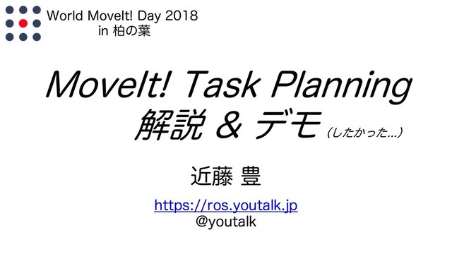 World MoveIt! Day 2018 in Kashiwa-no-ha(柏の葉)https://rosjp.connpass.com/event/101407/ で発表した資料です。 #ROSCon2018 で発表されたmoveit_task_constructorパッケージの解説とデモ(ごく一部)を行なっています。