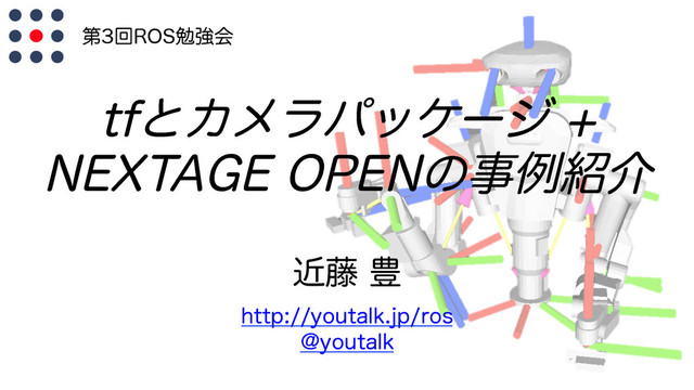 8/30に開催された「第3回ROS勉強会」の発表資料です。ROSのtfとカメラパッケージについてNEXTAGE OPENを例に取りながら紹介しています。