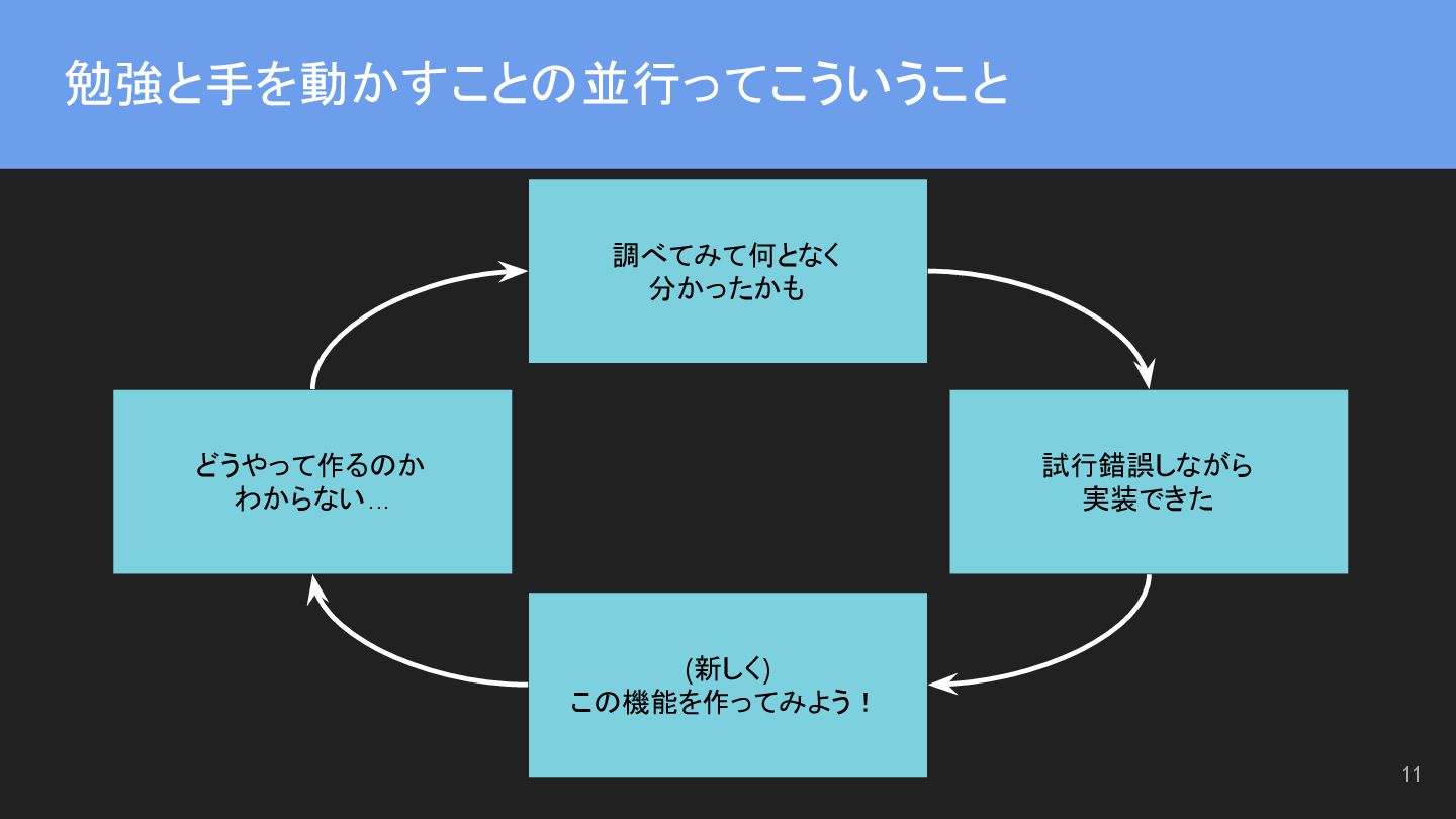 勉強と手を動かすことの並行ってこういうこと 11 (新しく) この機能を作ってみよう! どうやって作るのか わからない... 調べてみて何となく 分かったかも 試行錯誤しながら 実装できた