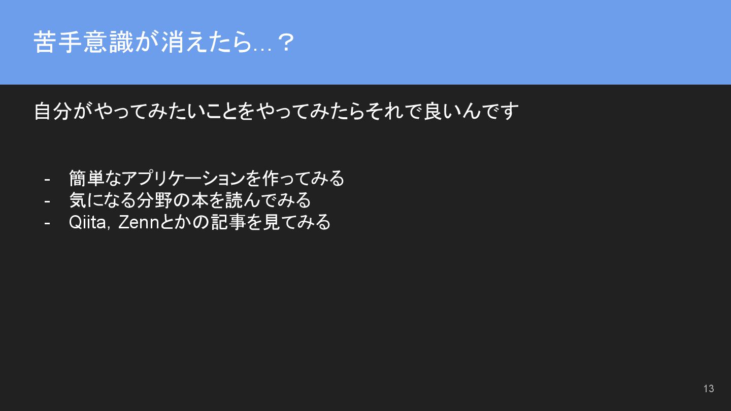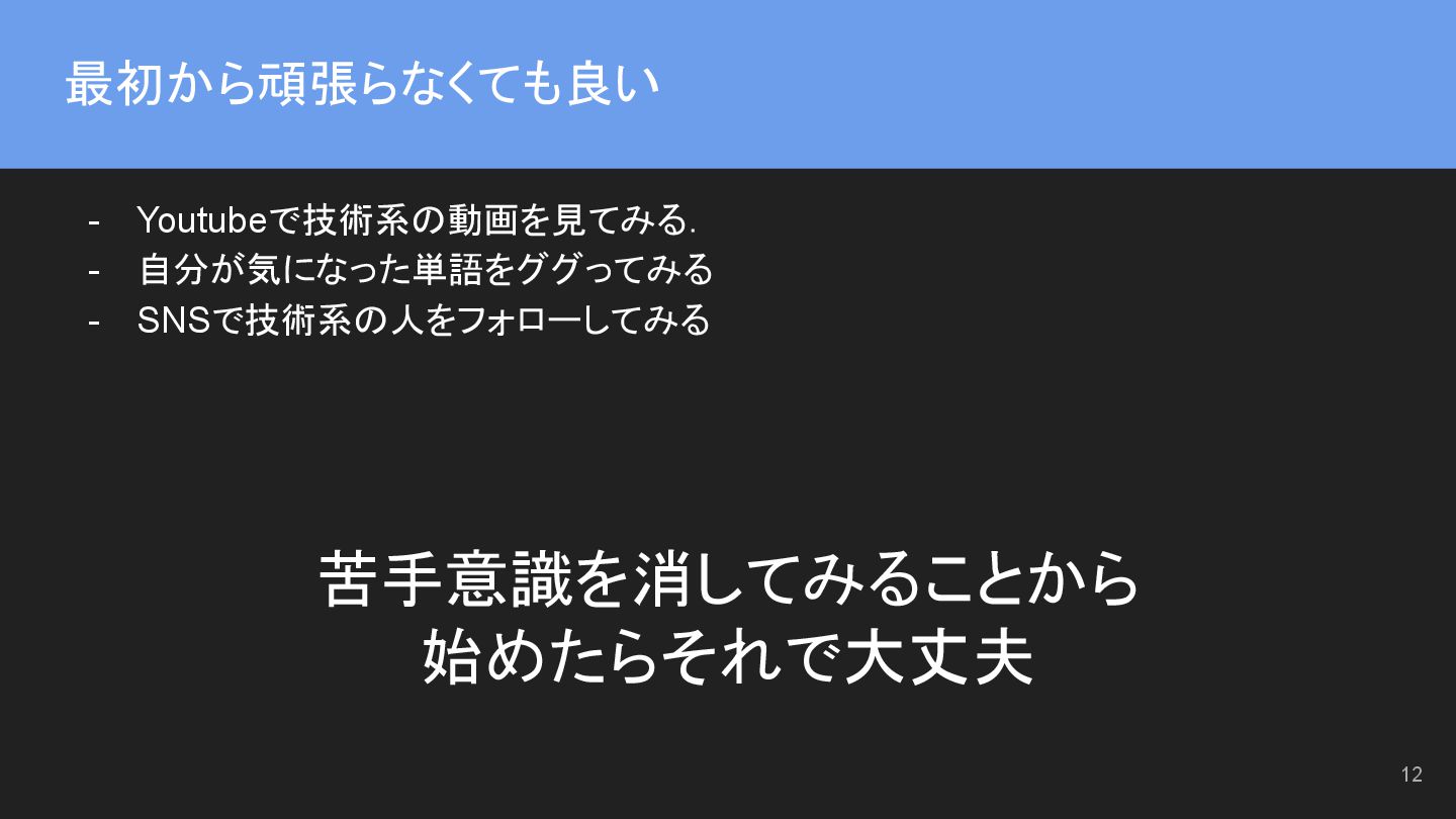 最初から頑張らなくても良い - Youtubeで技術系の動画を見てみる. - 自分が気になった単語をググってみる - SNSで技術系の人をフォローしてみる 12 苦手意識を消してみることから 始めたらそれで大丈夫