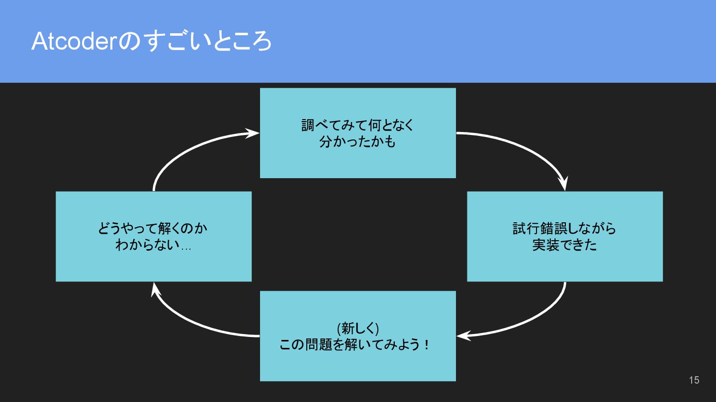 Atcoderのすごいところ 15 (新しく) この問題を解いてみよう! どうやって解くのか わからない... 調べてみて何となく 分かったかも 試行錯誤しながら 実装できた