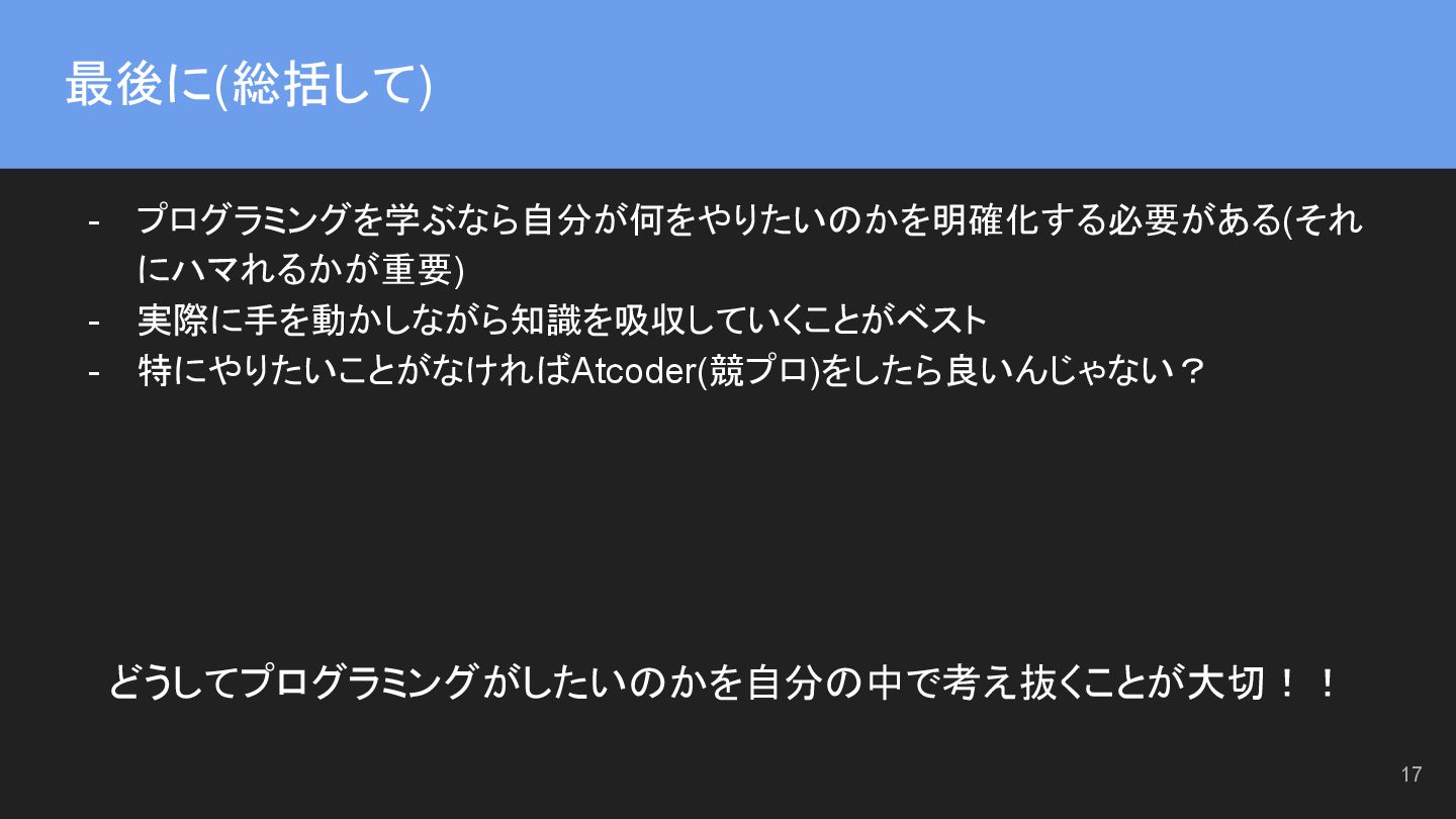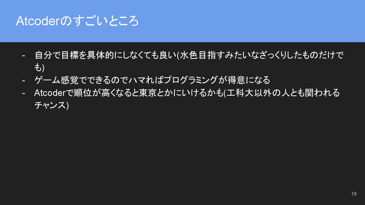 Atcoderのすごいところ - 自分で目標を具体的にしなくても良い(水色目指すみたいなざっくりしたものだけで も) - ゲーム感覚でできるのでハマればプログラミングが得意になる - Atcoderで順位が高くなると東京とかにいけるかも(工科大以外の人とも関われる チャンス) 16