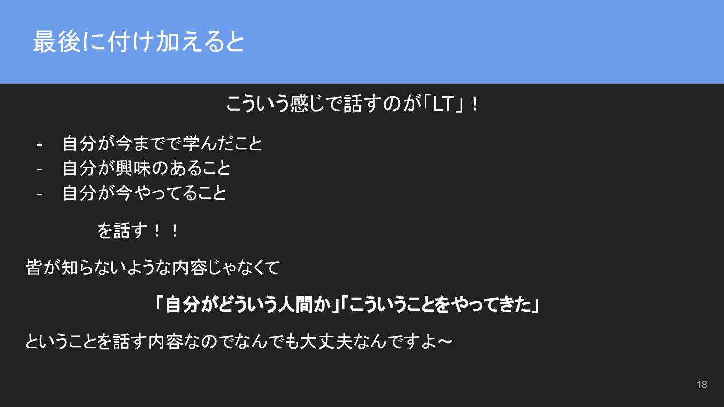 最後に付け加えると - 自分が今までで学んだこと - 自分が興味のあること - 自分が今やってること を話す!! 皆が知らないような内容じゃなくて 「自分がどういう人間か」「こういうことをやってきた」