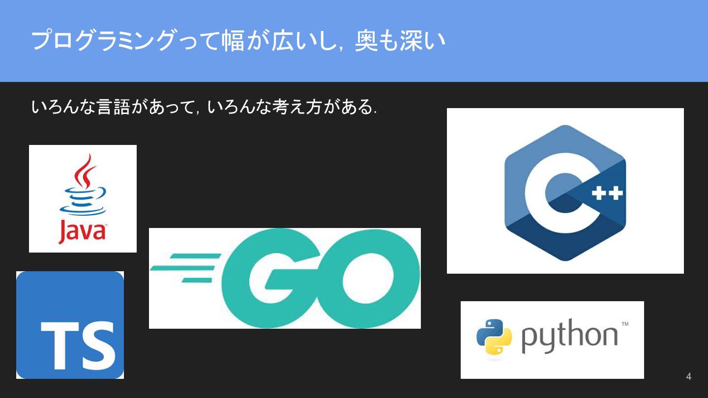 プログラミングって幅が広いし,奥も深い いろんな言語があって,いろんな考え方がある. 4