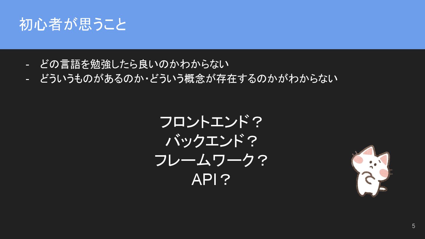 初心者が思うこと - どの言語を勉強したら良いのかわからない - どういうものがあるのか・どういう概念が存在するのかがわからない 5 フロントエンド? バックエンド? フレームワーク? API?