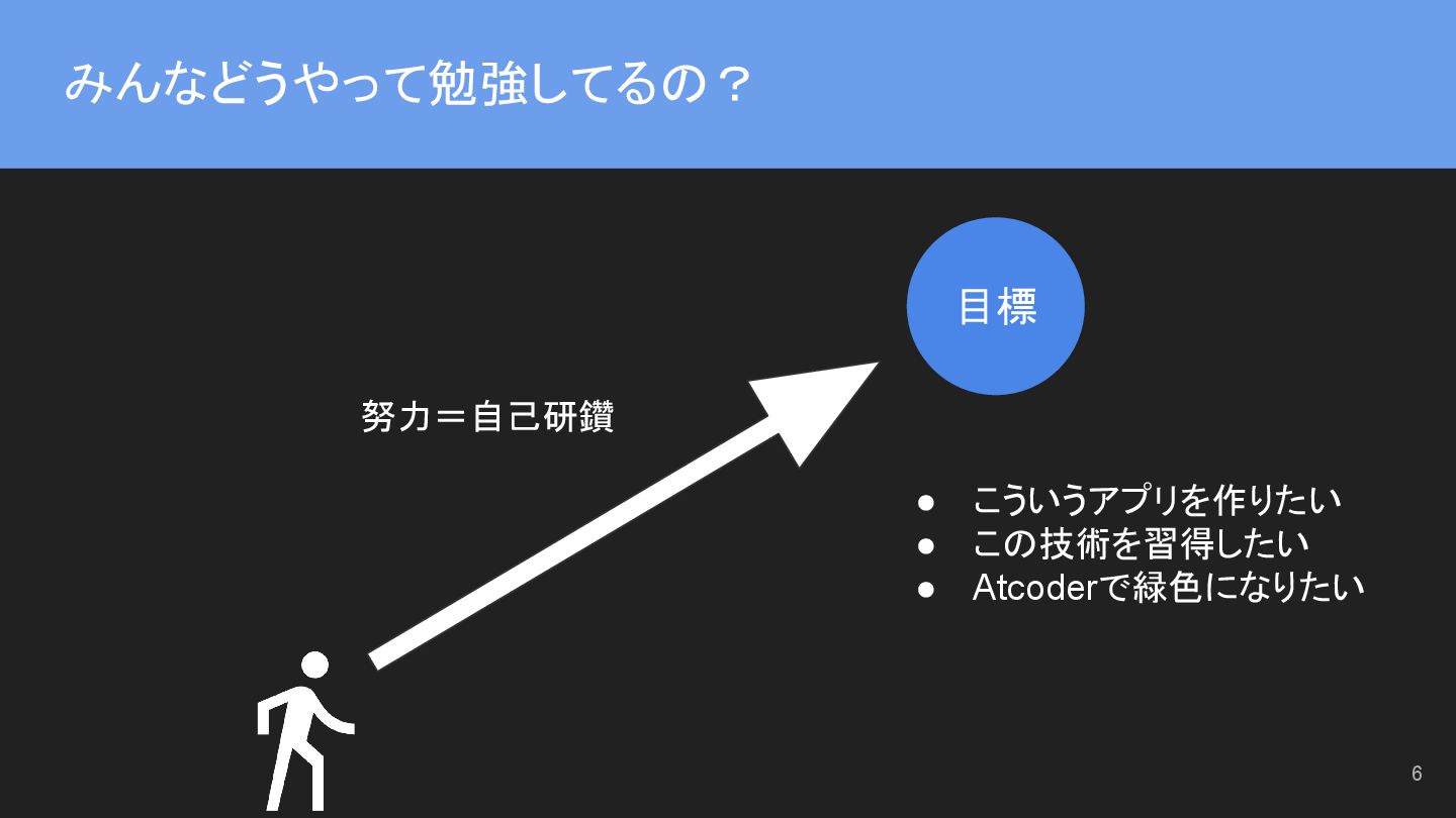 みんなどうやって勉強してるの? 6 目標 • こういうアプリを作りたい • この技術を習得したい • Atcoderで緑色になりたい 努力=自己研鑽