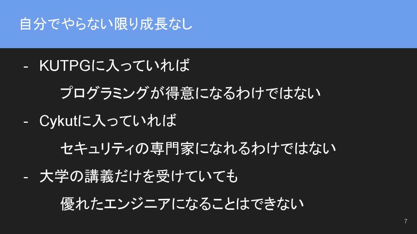 自分でやらない限り成長なし - KUTPGに入っていれば プログラミングが得意になるわけではない - Cykutに入っていれば セキュリティの専門家になれるわけではない - 大学の講義だけを受けていても 優れたエンジニアになることはできない
