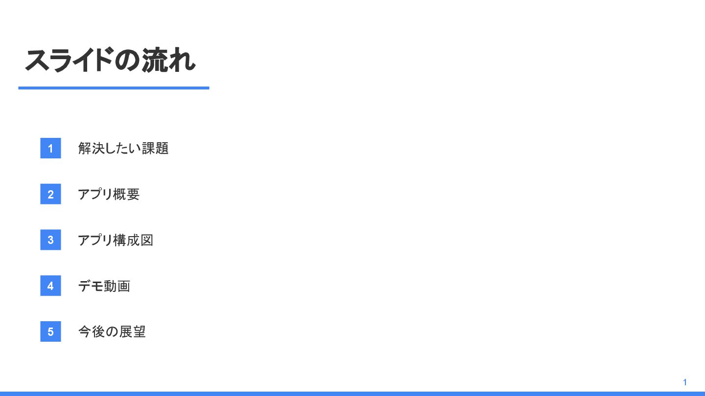 スライドの流れ 1 解決したい課題 2 アプリ概要 3 アプリ構成図 4 デモ動画 1