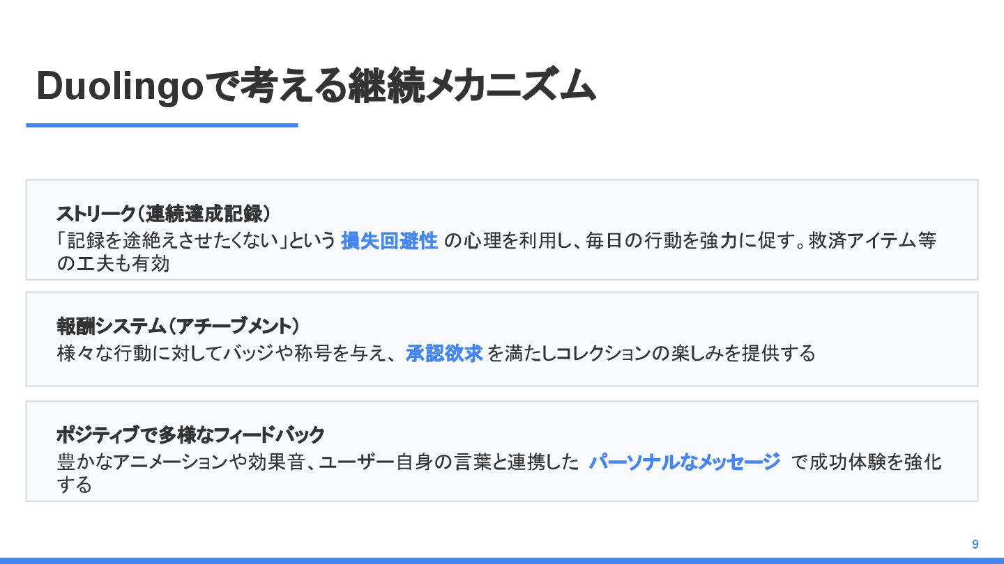 Duolingoで考える継続メカニズム ストリーク(連続達成記録) 「記録を途絶えさせたくない」という 損失回避性 の心理を利用し、毎日の行動を強力に促す。救済アイテム等 の工夫も有効 報酬システム(アチーブメント) 様々な行動に対してバッジや称号を与え、 承認欲求 を満たしコレクションの楽しみを提供する
