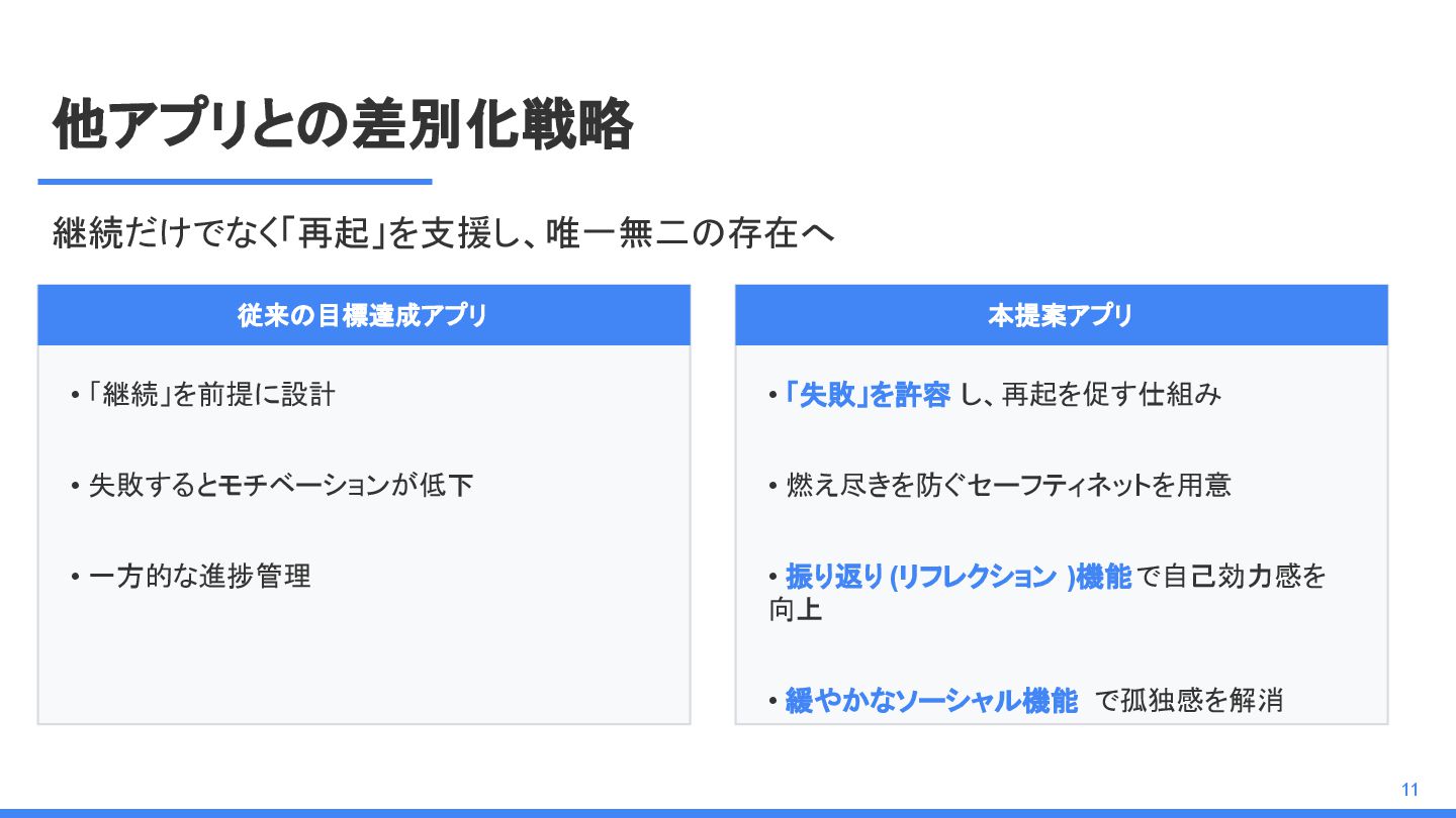 他アプリとの差別化戦略 継続だけでなく「再起」を支援し、唯一無二の存在へ 従来の目標達成アプリ • 「継続」を前提に設計 • 失敗するとモチベーションが低下 • 一方的な進捗管理 本提案アプリ