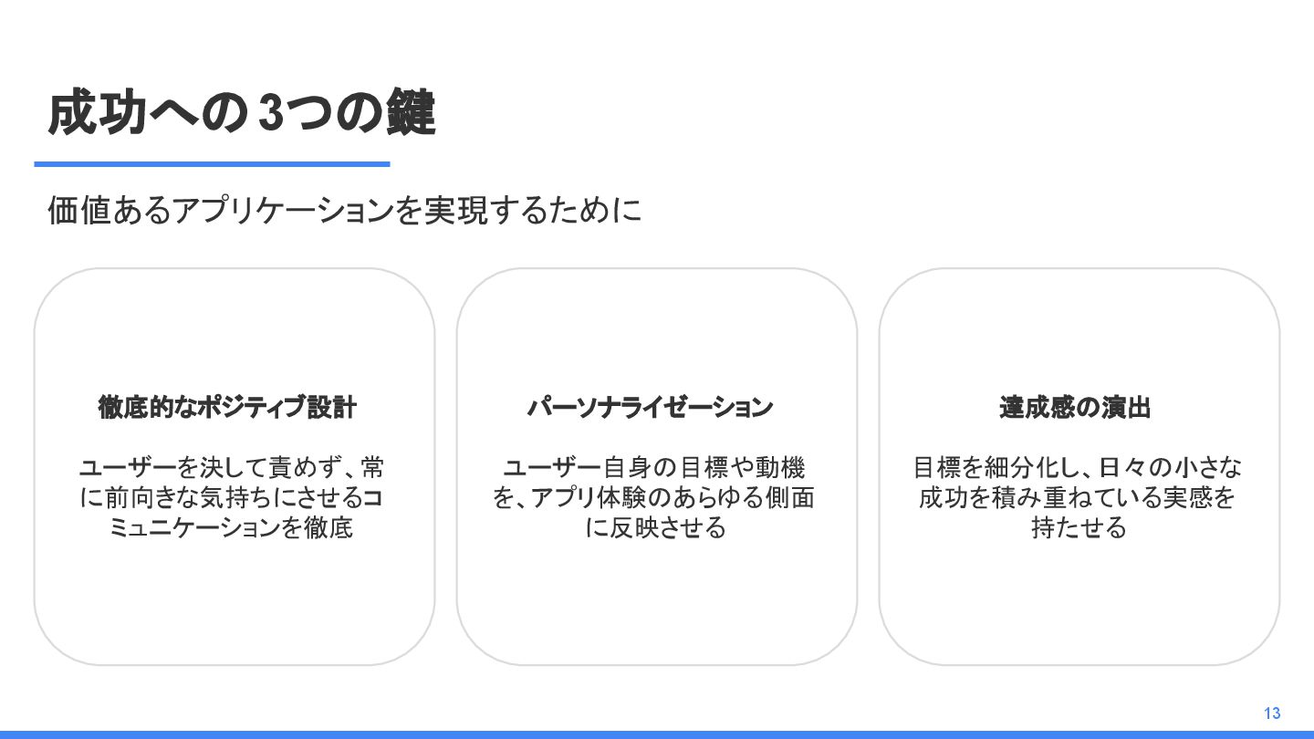 成功への3つの鍵 価値あるアプリケーションを実現するために 徹底的なポジティブ設計 ユーザーを決して責めず、常 に前向きな気持ちにさせるコ ミュニケーションを徹底 パーソナライゼーション ユーザー自身の目標や動機 を、アプリ体験のあらゆる側面 に反映させる