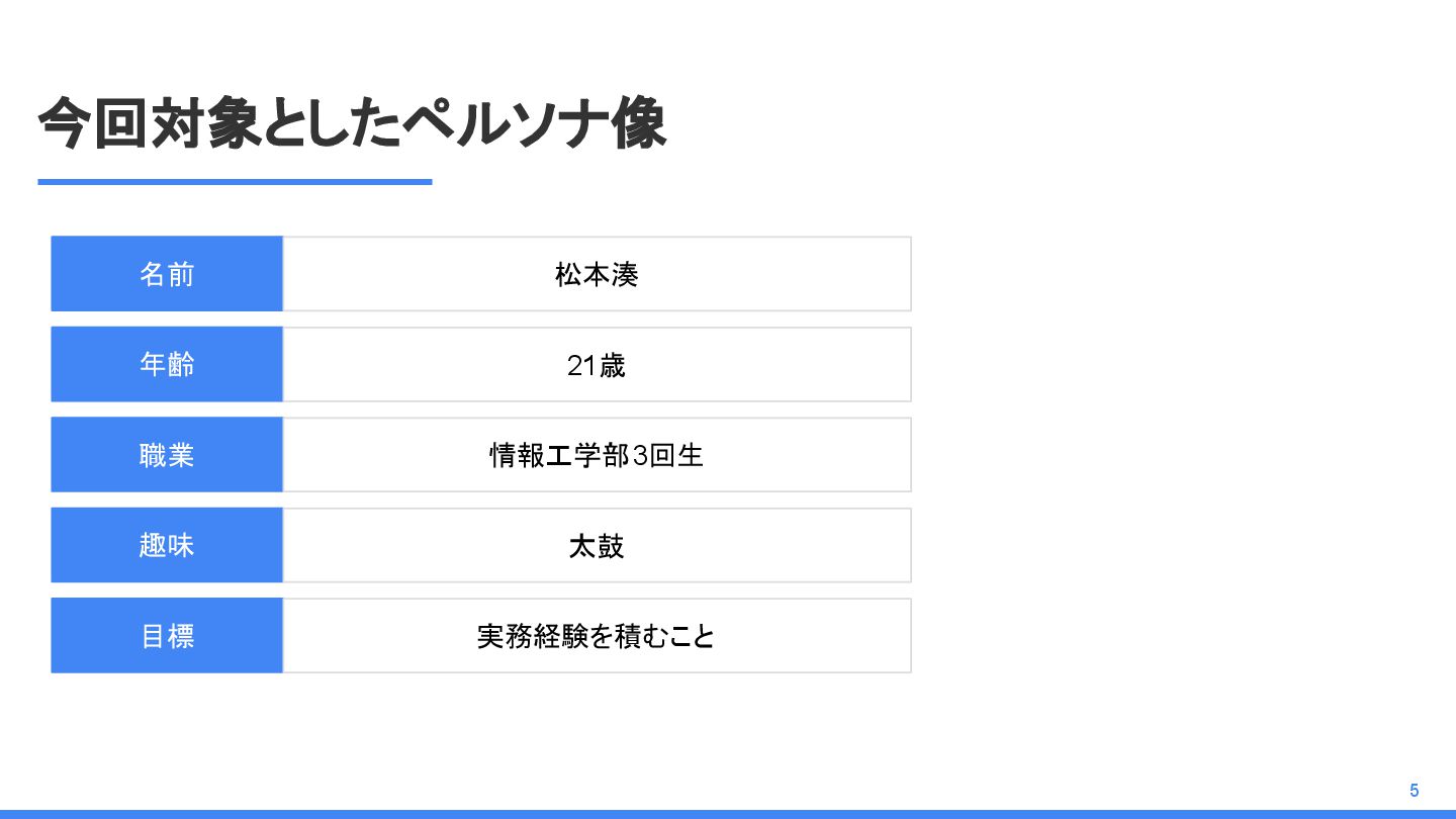 今回対象としたペルソナ像 5 名前 松本湊 年齢 21歳 趣味 太鼓 目標 実務経験を積むこと